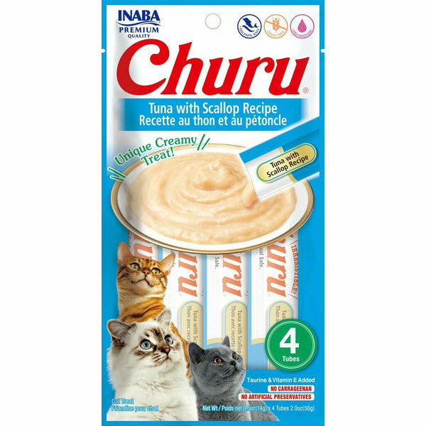 Nourish your kitty from the inside out by rewarding her with an Inaba Churu Grain-Free Skin & Coat Tuna with Scallop Recipe Lickable Cat Treat! These purr-worthy goodies are made with 100% pure and natural wild tuna and scallop. Omega-3 fatty acids from fish oil help maintain skin and coat health, while the lickable formula offers your feline friend the moisture she needs for overall health. Your kitty will love the creamy texture and savory flavor and you’ll love knowing that these treats are 100% free from grains, preservatives and artificial colors. To feed by hand, simply tear the tube open and give it a squeeze! You can also pour these rewards or use them as a tasty topper on wet or dry food.