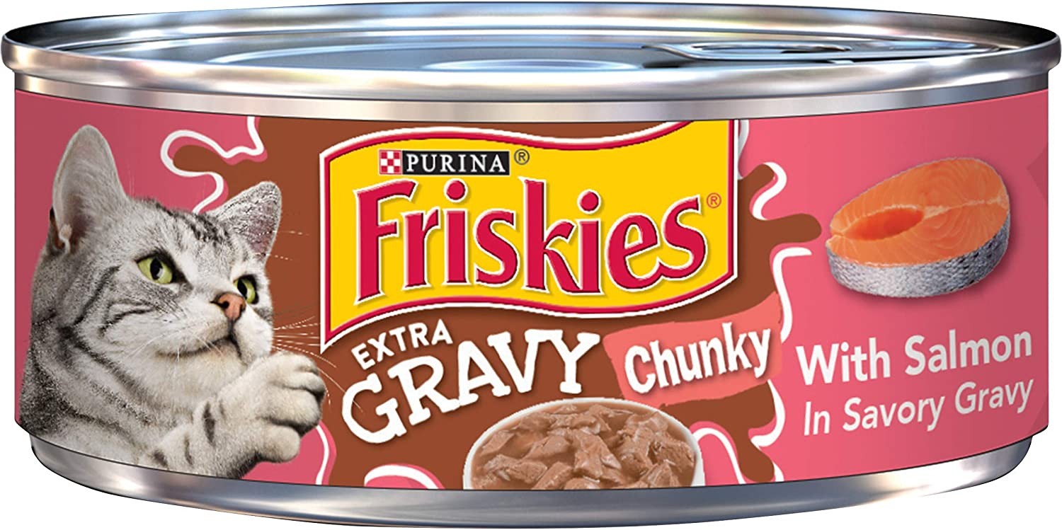 You’ll be dishing up spoonfuls of deliciousness when you feed your feline friend Friskies Extra Gravy Chunky with Salmon in Savory Gravy Canned Cat Food. This mouth-watering recipe features big meaty chunks marinating in a thick, rich gravy your furry friend is sure to love. Formulated with added vitamins and minerals, this food provides complete and balanced nutrition for adult cats. It can be served as a complete meal or used as a topper over dry kibble to help entice a finicky eater; the extra moisture content is also a convenient way to help keep your kitty hydrated.